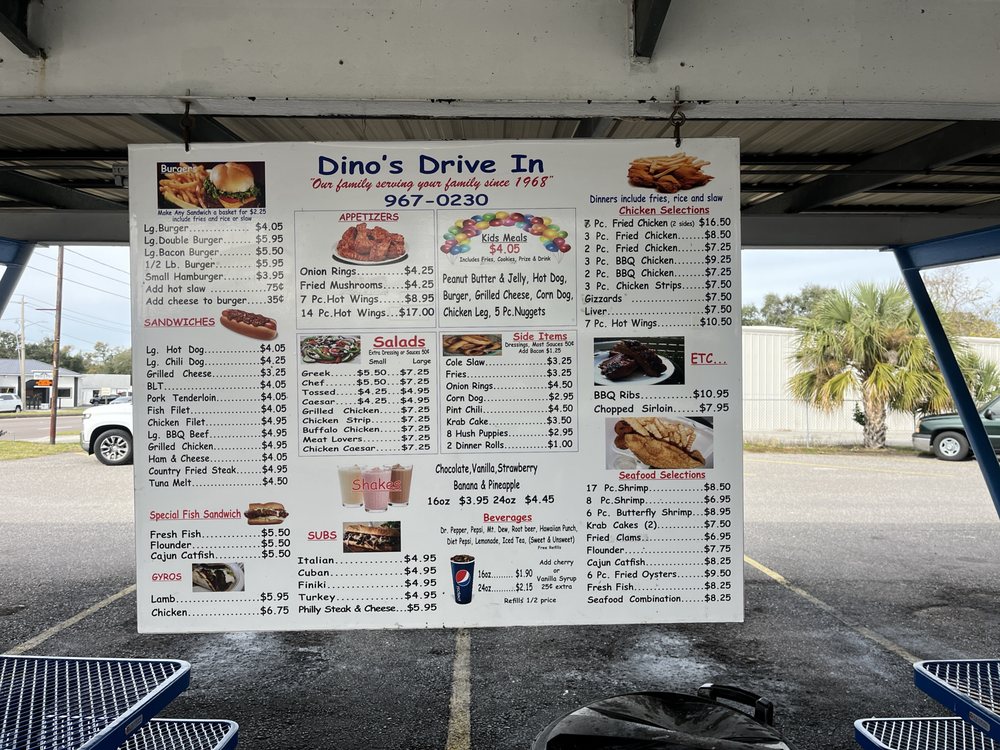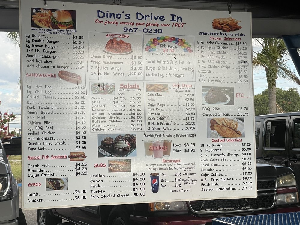 Dino's Drive-In is a classic American eatery located in Winter Haven, FL, offering a diverse menu of barbeque, burgers, and seafood. With a friendly staff and efficient service, Dino's Drive-In is known for their takeout, delivery, and catering options, making it a perfect choice for all occasions. The menu features a variety of appetizers, salads, and sandwiches, including favorites like hot wings, grilled chicken salad, and fish filet sandwich. Customers rave about the consistently delicious food and affordable prices, with many highlighting the quick service and welcoming atmosphere. Whether you're a longtime regular or a first-time visitor, Dino's Drive-In is sure to satisfy your cravings for hearty, homemade dishes in a relaxed setting. Make sure to stop by and experience the hidden gem that is Dino's Drive-In.